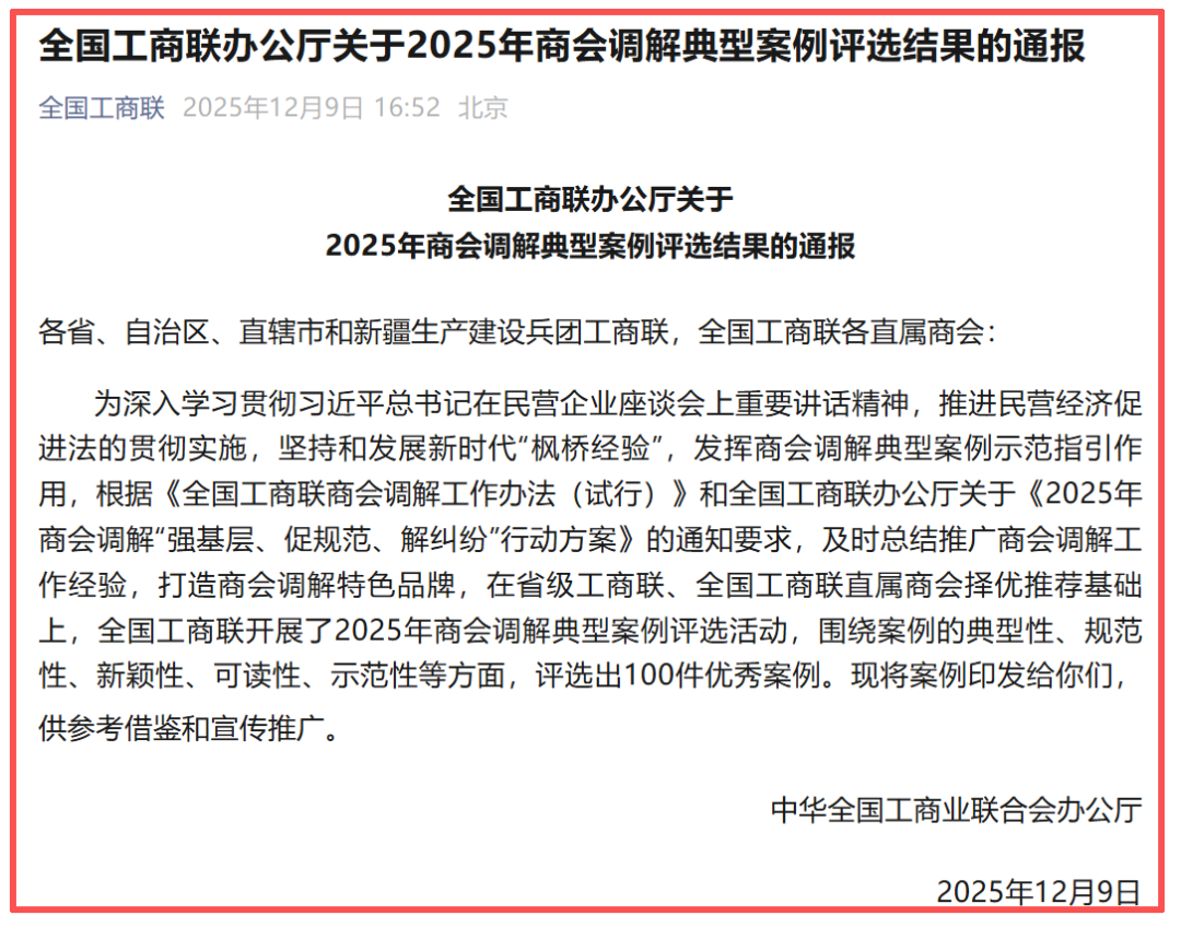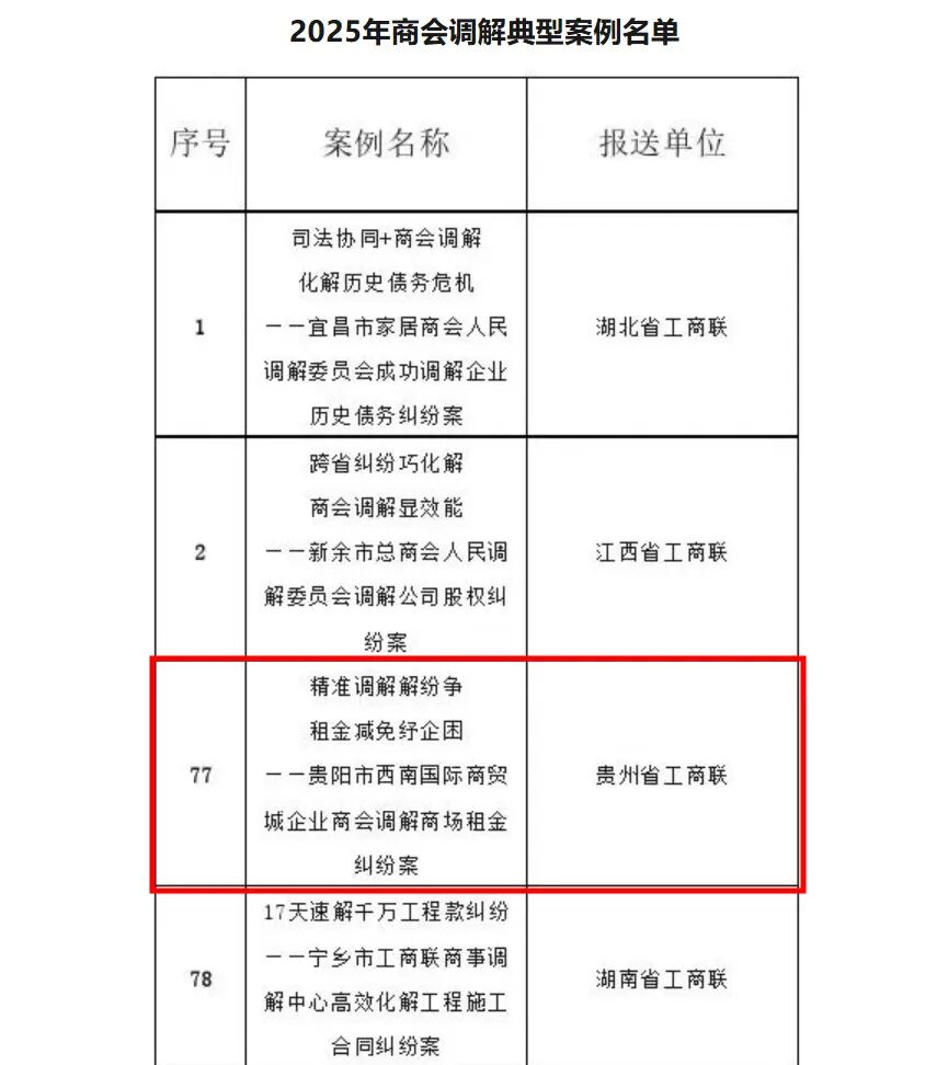 12月9日,全国工商联办公厅印发《关于2025年商会调解典型案例评选结果的通报》,贵阳市贵阳西南国际商贸城企业商会成功化解六号广场租金纠纷的案例入选全国百件优秀案例。这一荣誉体现了贵阳商会调解工作在实践中取得的显著成效,也是我市工商联持续推进民营经济领域纠纷多元化解机制建设的生动缩影。